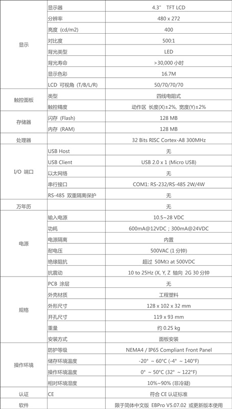 • 4.3" 480x272 TFT LCD, LED 背光燈